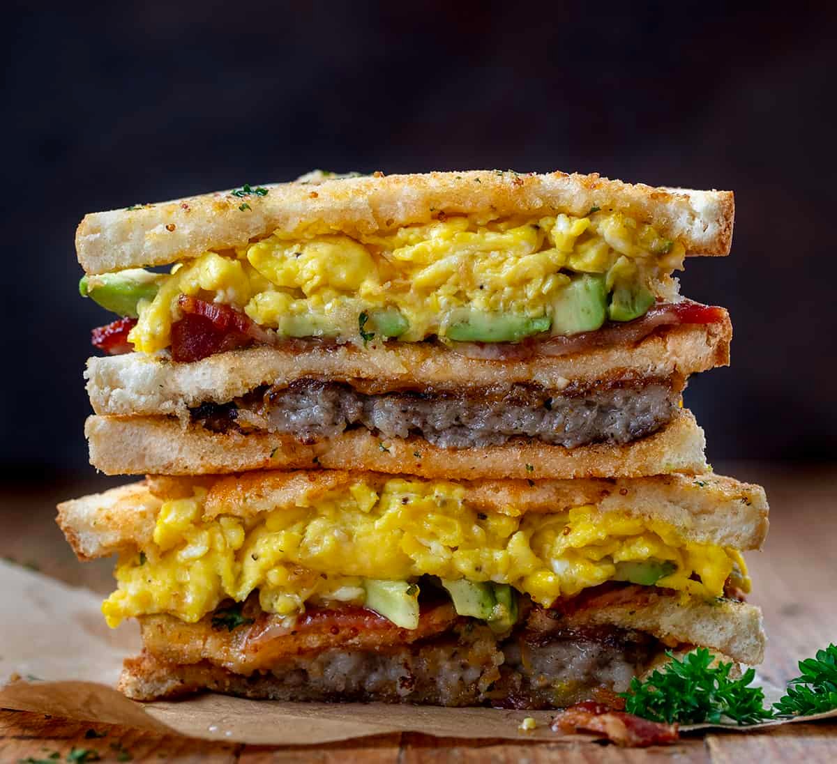 ソーセージを半分に切る. トースト1枚の上にソーセージを3切れ並べる. ベーコンをのせる. マッシュルームをのせる. トーストをもう1枚のせる その上に: ケチャップまたはブラウンソース を塗る。次に: ハッシュブラウン2個. その上に卵
