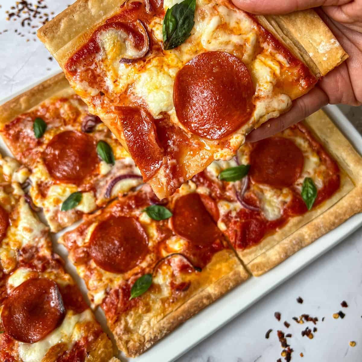 8. Bake for 20 minutes until golden. While still hot, drizzle with 1–2 tablespoons of olive oil. Cut into squares and serve warm or cold.